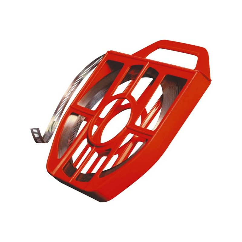 Le collier à façon, du plus petit au plus grand. Boîtier et bande en acier chromé inoxydable, vis en acier zingué bichromaté. Composé de : - 1 dévidoir de 25 m de bande sans fin ajourée, - 50 têtes.