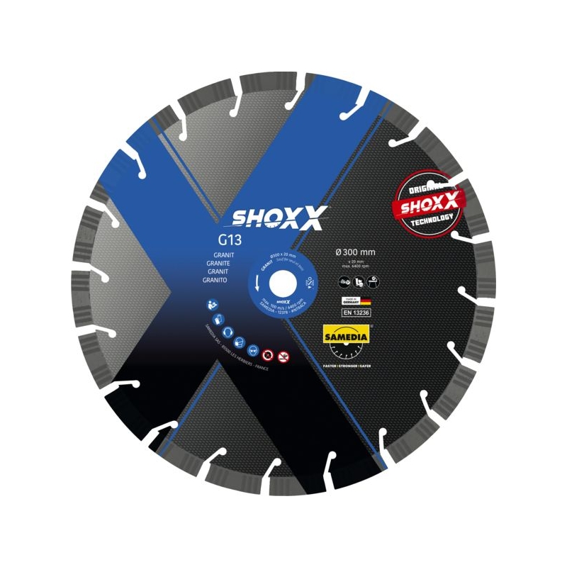 Pour une coupe ultra-rapide dans le granit et les matériaux très durs. Segments soudés au laser. Hauteur diamantée : 13 mm Norme : EN 13236