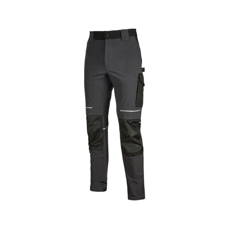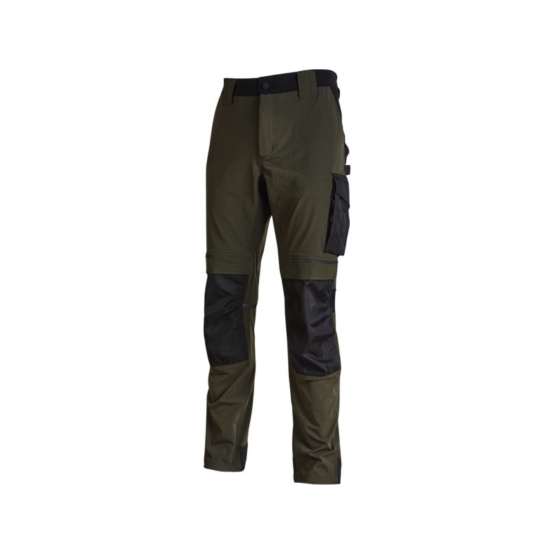 90% nylon 10% spandex, 260 gr/m2. Tissu stretch, doux au toucher, déperlant, respirant et au séchage rapide. Poche latérale porte-outils, poche latérale multifonction avec porte badge rétractable, 2 amples poches à l’arrière, 2 poches porte-genouillère à ouverture facile par le haut (réf 103541 à commander séparément), poches zippées cachées sous la grande poche latérale et sous la poche avant droite. Bas de pantalon entièrement renforcé en polyoxford 600D. Bavette à l’arrière pour une meilleure protection lombaire. Taille élastiquée avec un système innovant de serrage invisible. Coloris : noir/jaune, marine/orange Taille : M à 2XL