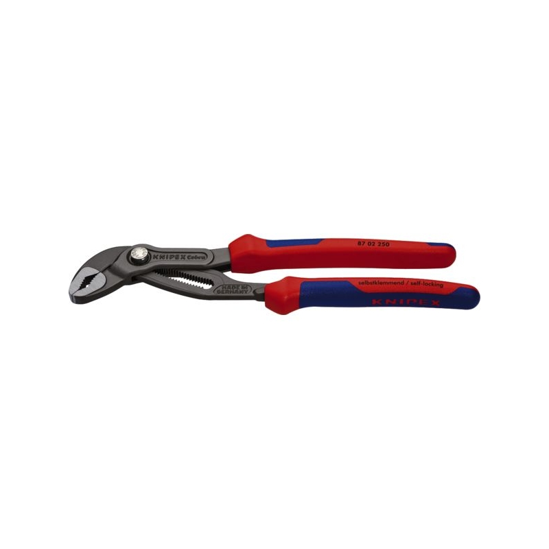 Pince multiprise et clé universelle en un seul outil. Charnière entrepassée, autobloquante sur tubes et boulons. Réglage immédiat et précis par simple pression de l'ergot. Mâchoires à dents spécialement trempées.