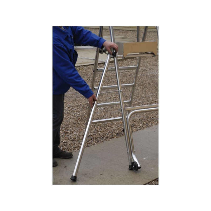 Utilisation sur sol plat. Usage intensif. En aluminium. Garde-corps fixe 360° avec portillon semi-automatique rigide. Plate-forme 400 x 490 mm avec plinthes intégrées. Marches striées antidérapantes de 60 mm. Tablette porte-outils. 2 roulettes Ø 100 mm pour les déplacements. Béquille arrière adaptée pour le passage des WC (sauf modèle 2 marches). Modèles 4 et 5 marches avec stabilisateurs. Charge maxi. : 150 kg Norme : PIRL NFP 93353 - Décret 2004.924