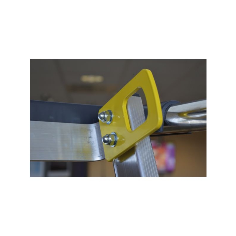 Utilisation sur sol plat. Usage ultra-intensif. En aluminium. Garde-corps 360° avec portillon semi-automatique rigide. Montants de 70 mm renforcés. Plate-forme anti-dérapante 600 x 420 mm avec plinthes intégrées. Marches striées antidérapantes de 80 mm. Tablette porte-outils intégrée. 2 roulettes Ø 160 mm pour les déplacements. Sabots antidérapants haute sécurité. Stabilisateurs à mise en place automatiques. Anneaux de grutage. Charge maxi. : 150 kg 3 à 6 marches : norme PIRL NFP 93353 - EN 131-7 - Décret 2004.924 7 à 8 marches : norme PIRL NFP 93352 - EN 131-7 - Décret 2004.924