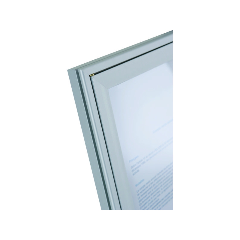 Porte battante, fermeture par serrure à clé avec pose à droite. Profil alu anodisé naturel, façade plexiglas avec entourage à partir du format 6 feuilles. Fond tôle blanc pour affichage magnétique. Fixation murale 4 points. Absence d'entourage de porte pour le format 4 feuilles. Épaisseur hors-tout : 20 mm Épaisseur utile : 12 mm